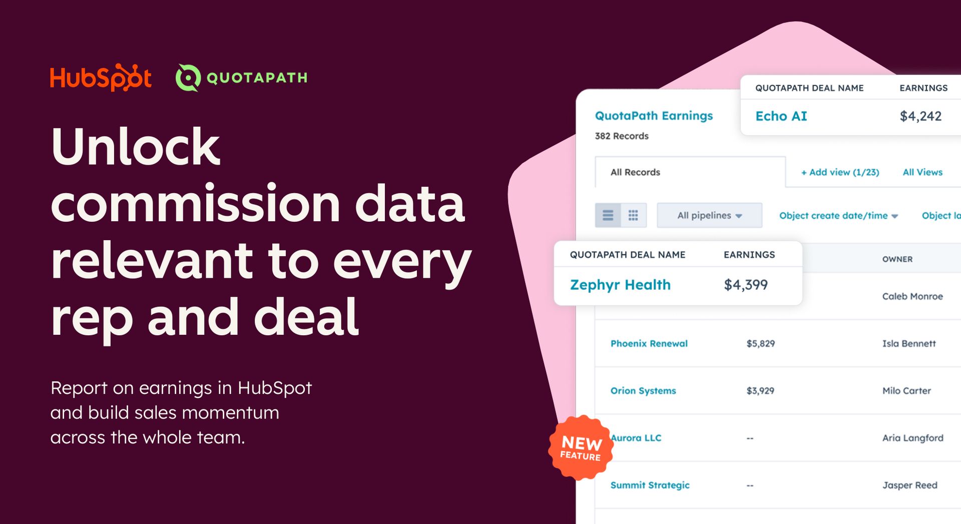 Context-switching kills sales velocity. QuotaPath's new Quota Attainment App Card surfaces real-time commission data directly in HubSpot deal records, while the native Earnings Object enables automated workflows and custom reporting. Join customers like Bluleadz seeing 3x ROI thanks to the QuotaPath app for HubSpot.